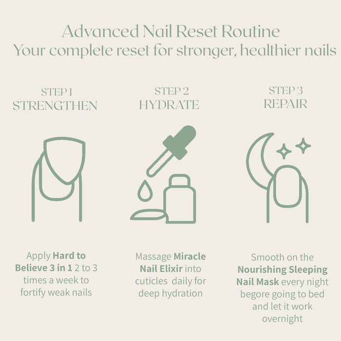 Restore strength, hydration, and vitality with this 3-step nail care set. Featuring our Hard to Believe Nail Treatment, Miracle Nail Elixir, and Nourishing Sleeping Nail Mask, it’s your complete routine for healthier, stronger nails — day and night.