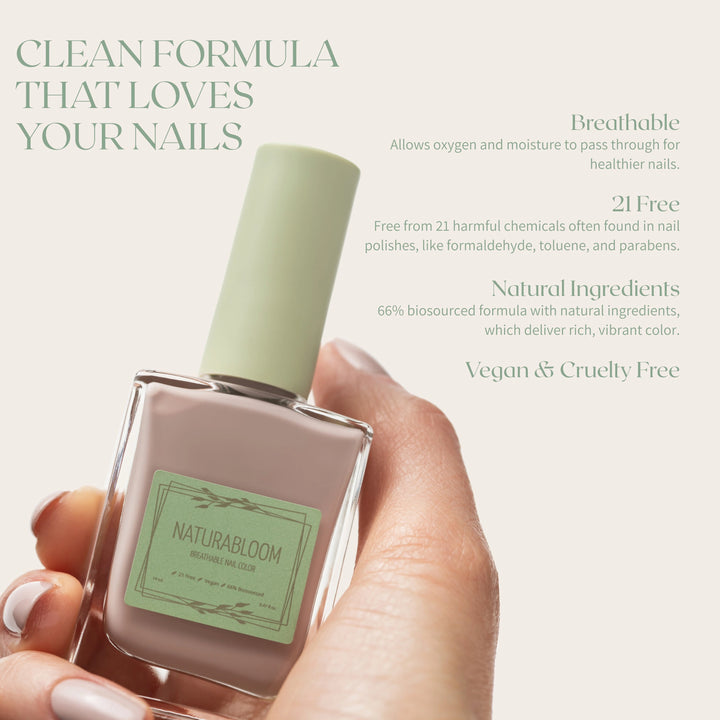 Discover the future of nail care with NATURABLOOM's breathable nail polish collection. Designed to nurture both your nails and the planet, our premium formula delivers exceptional shine and long-lasting wear without compromising on quality. Made with a patented 66% biosourced formula, our polishes are: