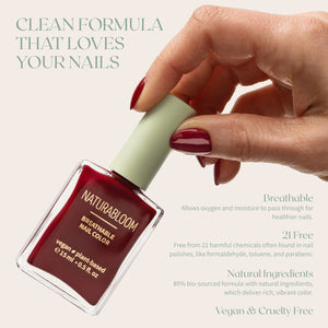 Discover the future of nail care with NATURABLOOM’s breathable nail polish collection — now powered by our upgraded 85% biosourced formula. Designed to deliver rich color, exceptional shine, and long-lasting wear, it nurtures your nails while respecting the planet.