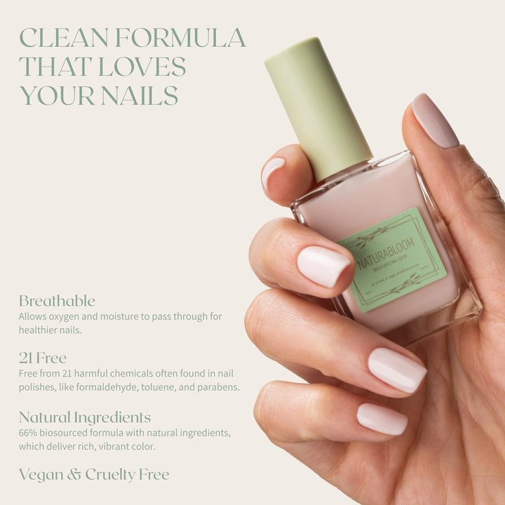 Discover the future of nail care with NATURABLOOM's breathable nail polish collection. Designed to nurture both your nails and the planet, our premium formula delivers exceptional shine and long-lasting wear without compromising on quality. Made with a patented 66% biosourced formula, our polishes are: